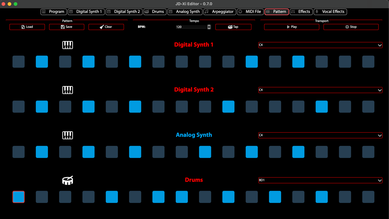 The editor represents a dedicated workspace optimized for pattern creation and sequencing, from basic step sequences to complex multi-part patterns. The editor automatically synchronizes with your JD-Xi hardware, ensuring that every change is instantly reflected in your synthesizer’s sound.