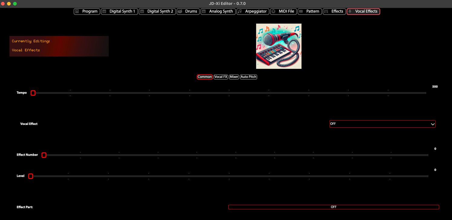 The editor represents a dedicated workspace optimized for vocal processing, from basic voice effects to complex voice transformation. The editor automatically synchronizes with your JD-Xi hardware, ensuring that every change is instantly reflected in your synthesizer’s sound.